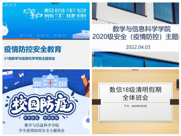 为深入贯彻学校疫情防控工作要求,支持学校封闭式管理、常态化防控和应急处置,引导学生安全学习、健康生活,进一步维护校园安全,4月3日至4日,数学与信息科学学院各年级辅导员主持召开疫情防控安全教育线上主题班会。