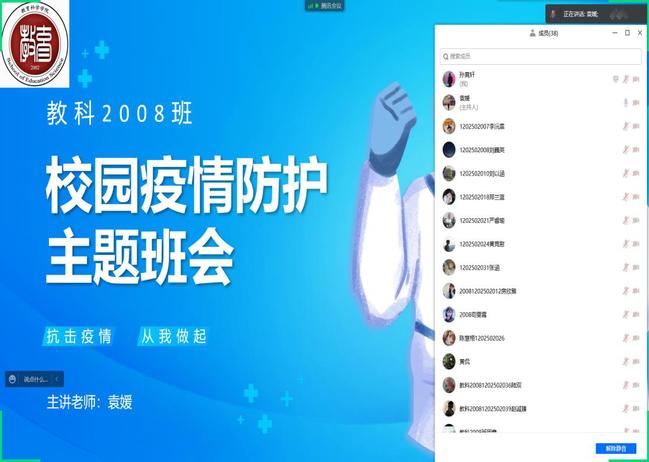 为更好落实学校疫情防控措施,提高学生防护意识,在关键时期织好织牢疫情防控网,教育科学学院各班级于4月5日至6日召开疫情防控主题班会,该院全体学生积极参与。