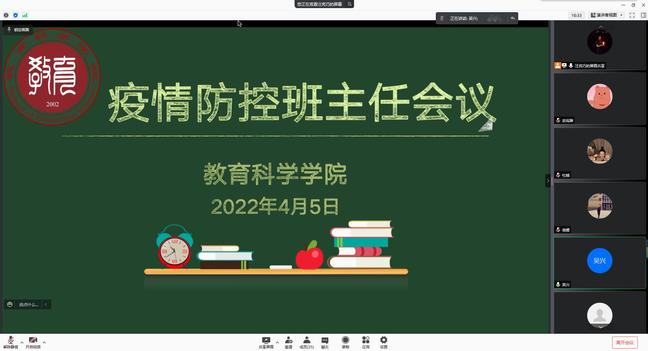 为进一步从严从紧抓好新冠肺炎疫情防控工作,切实保障学校师生的生命安全,教育科学学院于4月4日、5日在线上分别召开疫情防控工作系列会议。本次系列会议,包含班主任工作会议、学生干部工作会议、各年级各班级班会。学院党总支书记吴月华、党总支副书记吴兴、全体班主任老师、辅导员老师出席,全体同学参加。会议围绕对新冠肺炎疫情防控工作进行了再部署,再强调,再落实。
