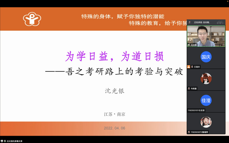 为进一步加强同学们对考研的认识,帮助同学们明确考研目标,掌握相关考研技巧,缓解备考焦虑,康复科学学院以线上会议的形式,于4月6日晚举办2023届考研系列讲座(二)。本次讲座邀请到我校976班优秀毕业生、深圳元平特殊教育学校高级教师、东北师范大学博士研究生沈光银老师作主讲嘉宾。沈老师讲座的主题为“为学日益,为道日损——吾之考研路上的考验与突破”。本次讲座由康复科学学院辅导员王国庆主持,2019级有意向考研同学积极参与。