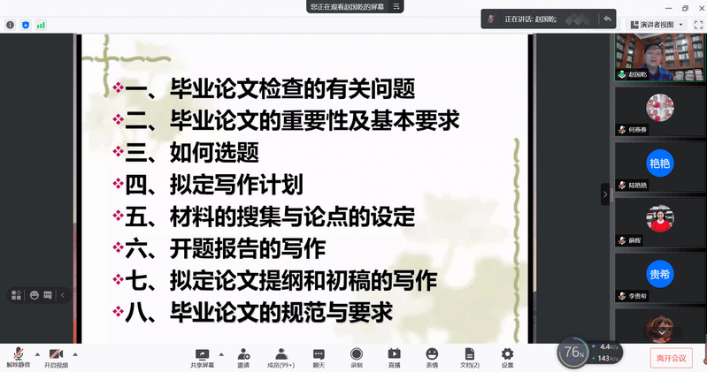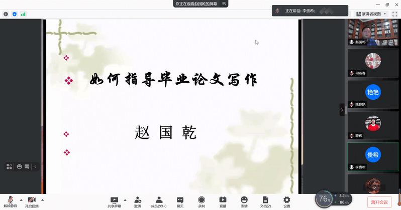 4月8日,为了更好地推进本科生毕业设计(论文)的指导工作,帮助指导教师更快更好地指导学生论文,提高学生的毕业论文质量,学校教务处邀请南京晓庄学院的赵国乾教授来我校进行讲座,讲座采用腾讯会议形式。全校158名本科毕业论文指导教师参加会议。教务处副处长李贵希主持会议。