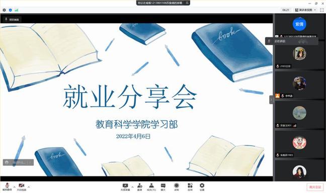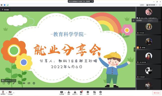 为让同学们进一步了解就业、考研的更多细节,消除疑虑困惑,对未来就业方向进行合理规划,教育科学学院于4月6日晚在线上举办“青春无悔 扬帆起航——就业经验分享会”,本次活动邀请了签约幼儿园、妇幼保健院等单位的18级优秀学生代表作为分享嘉宾,该院各级同学积极参与。