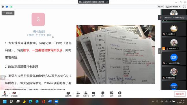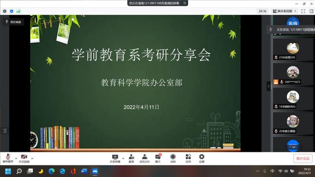 为向考研学生提供考研及就业经验,消除内心疑虑,使大一同学更早接触了解考研,帮助大二大三同学更全面认识考研形势,教育科学学院于4月11-12日举办考研就业经验线上分享会,邀请优秀毕业生分享自己的心得,全体学生积极参与。