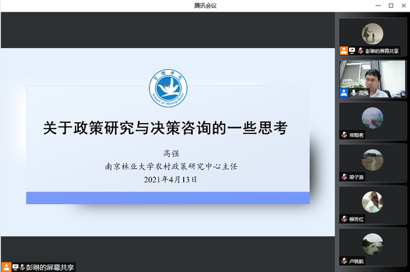 为切实提升教师的科研水平,活跃学术氛围,4月13日下午,管理学院在线举行“书香·厚学”——迎40年校庆共享论坛系列学术讲座,讲座邀请到南京林业大学农村政策研究中心主任、教授、博士生导师高强主讲。论坛由院长杨会良主持。学院全体院领导、全体教师参加了本期活动。