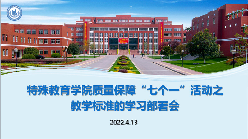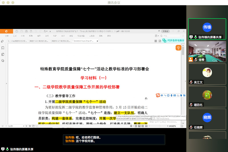 为进一步完善二级学院教学质量保障体系,形成不断提高教学质量的长效机制,4月13日下午,特殊教育学院在线上召开了质量保障“七个一”活动之教学标准的学习部署会,副院长张伟锋带领全院教师开展专题学习。学院领导班子、全体教师和教学行政人员参加会议。