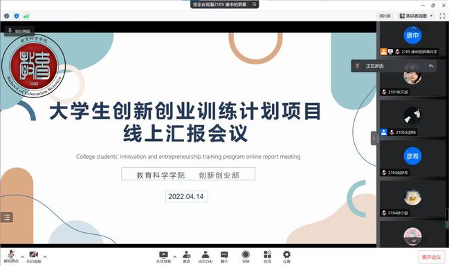 为引导学生树立正确的创业观和就业观,带动更多学生投身创新创业社会实践,教育科学学院日前线上举办“大学生创新创业训练计划项目”线上汇报会,该院全体同学积极参与。