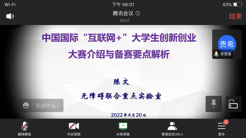 为调动学生积极参加“互联网+”大学生创新创业大赛,深入了解“互联网+”大学生创新创业大赛的主题、赛道、组别等相关信息,帮助学生选择合适的赛道和组别,有的放矢地参加比赛,4月21日,学校教务处特邀陈文博士为我校学生开展在线讲座。全校200多名学生和指导教师参加了会议。教务处副处长李贵希主持会议。