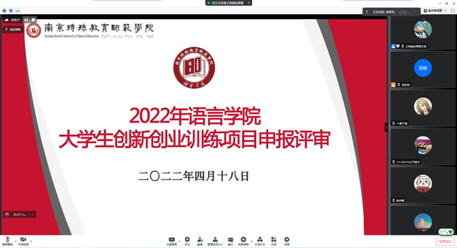 4月18日晚,语言学院举办2022年大学生创新创业训练计划项目线上申报评审会。由学院执行院长王东、党总支副书记谢军、英语系主任赵冬华、中文系国丽芸副教授、大学外语教研室王振环副教授等五位教师组成的专家评审组对申报项目进行评审。本次评审会由语言学院副院长徐琴芳教授主持,项目负责人同学、项目指导老师、项目组成员等参加会议。
