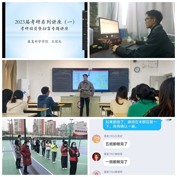 康复科学学院王国庆老师同样和封闭在校的同学们战斗在一起。博雅楼与寝室都成为了王老师的办公室,充当“指挥员”“心理委员”“宣传员”和“服务员”,帮助学生解决各种困难,用实际行动践行着辅导员的初心和使命。为了解学生的学习状况,他专门建立了学习委员群,每天检查各班的上课情况。他还通过开展学风建设主题班会、巡查线上课堂和每周走访宿舍,进一步督促与帮扶学业困难学生。为了解学生的心理状况与遇到的困难,他通过定期开展班会、与宿管沟通、主动找学生谈心谈话等方式了解同学们目前生活状况,从而针对性帮助与疏导。为了让同学们进一步认识并理解学校的疫情防控政策,通过开展线上年级大会向同学们耐心解释与疏导,教育引导同学们统一战线,一同克服当前困难。为进一步加强同学们对研究生入学考试的认识,帮助同学们明确考研目标,掌握相关考研技巧,缓解备考焦虑,他举办2019级学生考研系列讲座,目前已进行到第三讲。