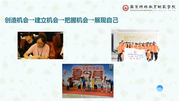 做有梦想的积极行动者。王昕媛同学首先以自己经历的“三座大山”展开分享宝贵经验。进入南京特殊教育师范学院求学、加入伯藜学社、决定考研是她在大学里所面临的“三座大山,”尝试、调整、积累是她开始蜕变提升自己的最优方式。她就大学学习生活、考研学习方法及读研后的感受进行了详细的阐述,很多的第一次让她为后面的路打下基础,专业课排名第一、成为伯藜学社副社长、考研成功等。从她的经验分享中,可以看到自信、努力、坚持是她翻越“三座大山”的秘诀。