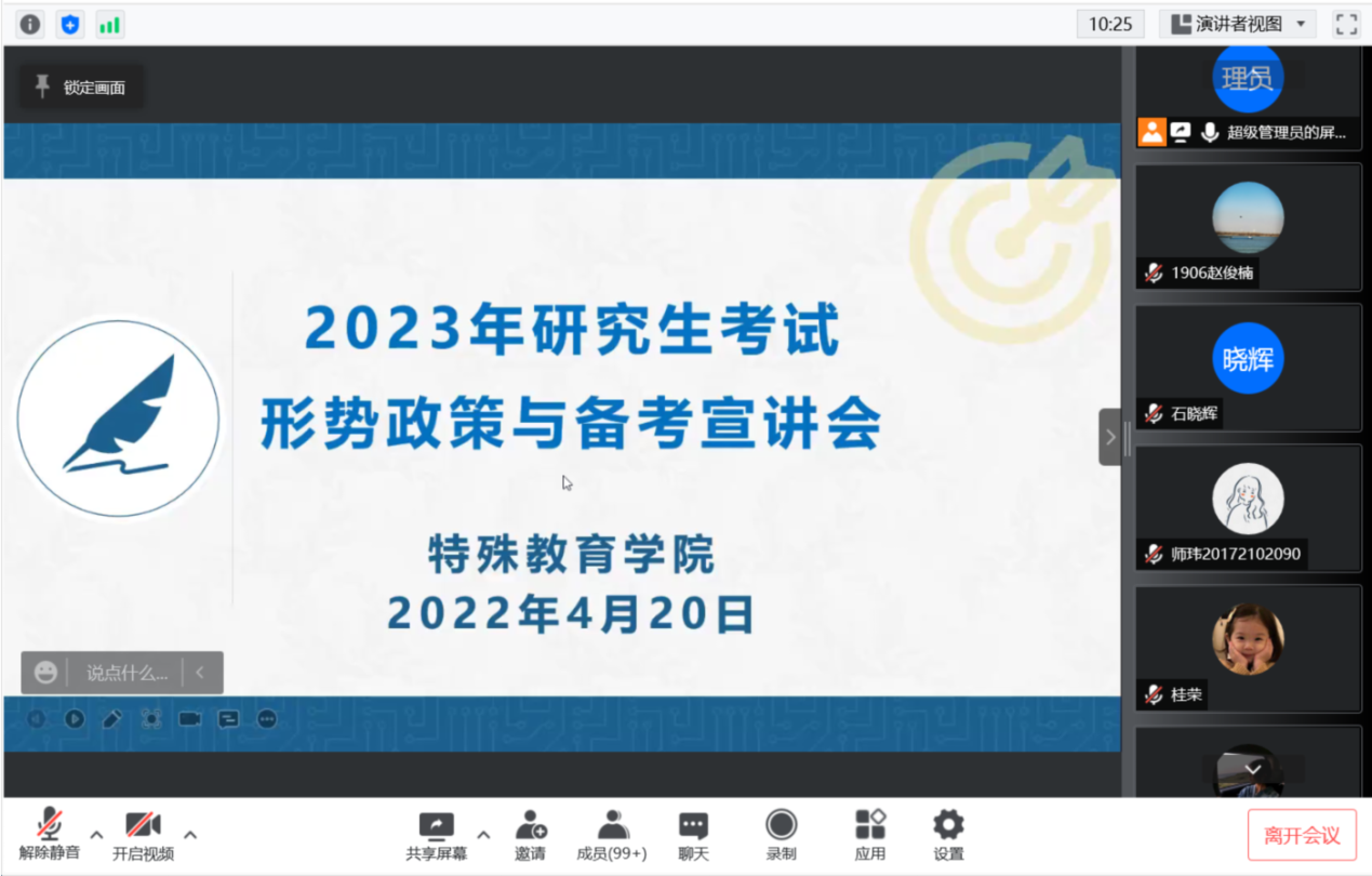 为帮助2019级学生对2023年考研形势有清晰认知,前瞻性地把握当前备考策略,加强疫情期间安全教育,特殊教育学院于4月20日下午通过腾讯会议召开2023年研究生考试形势政策与备考宣讲会暨安全教育工作会议,会议邀请奇林教育考研规划师浦冬梅老师宣讲,院党总支书记叶亮、党总支副书记李鹏、19级辅导员和班主任老师以及2019级全体学生参加。会议由19级辅导员邓露老师主持。