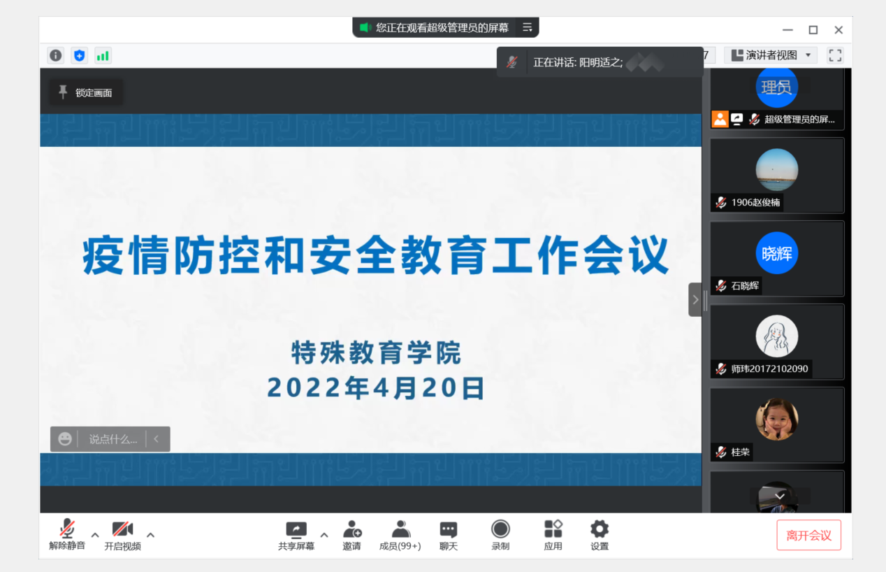 李鹏副书记布置学院疫情防控与安全教育工作。他首先感谢同学们对学院疫情防控工作的支持与配合,围绕健康打卡、核酸检测、相关管理规定做好了详细工作布置,希望同学们进一步强化疫情防控的思想认识,在疫情防控中树牢责任意识;积极学习生活,争当表率,彰显特教学子担当精神,在疫情防控中锤炼意志、长才干、促成长;养成良好作息习惯,健康饮食,预防春季疾病。
