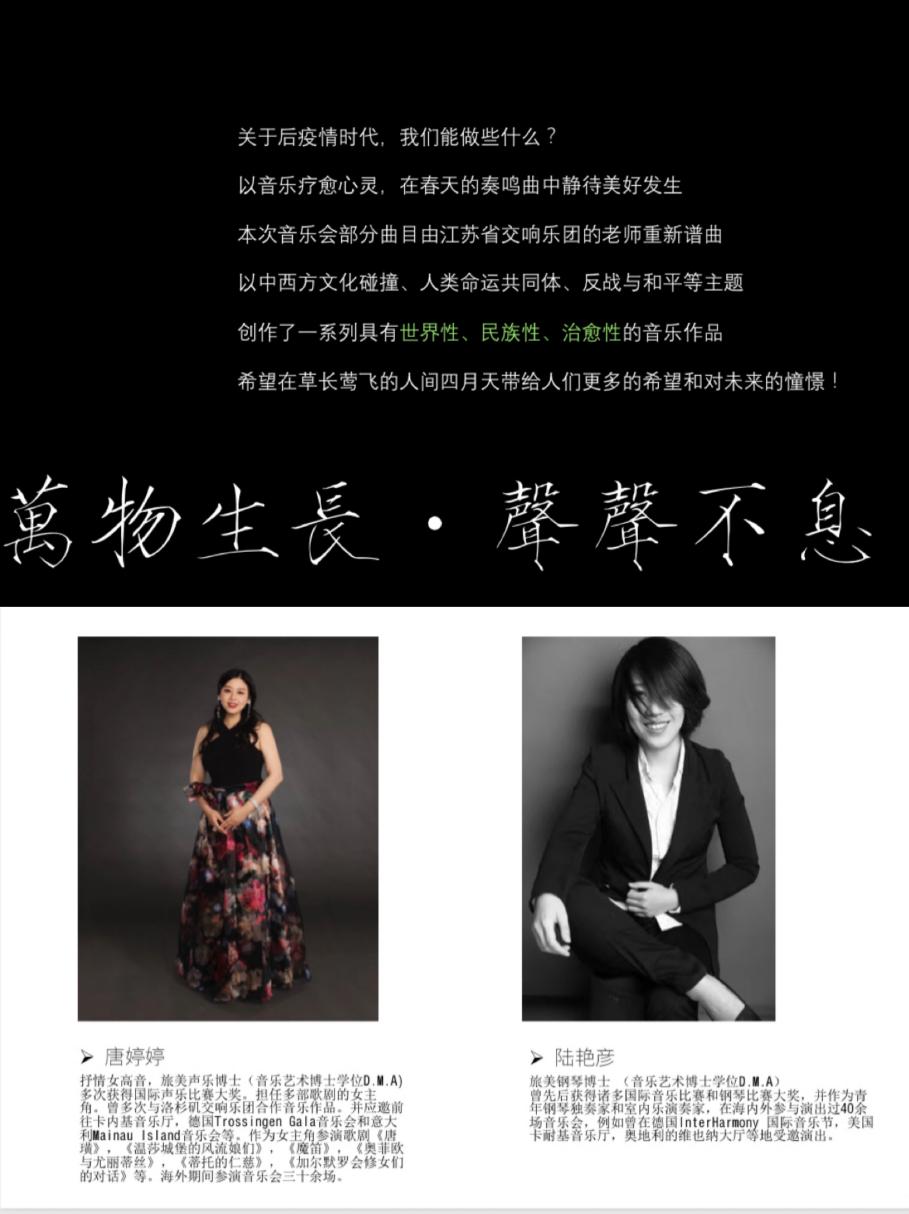 为弘扬伟大抗疫精神,在做好疫情防控的前提下,由南京市秦淮区人民政府夫子庙办事处、南京城南历史文化保护与复兴集团有限公司、江苏省交响乐团、江苏省演艺集团等单位联合主办,南京门东“花漾音乐季”于4月21日-25日举行,以“万物生长、生生不息”为主题,为南京人民带来了一场温暖人心、古典于现代交融的视听盛宴,展现了伟大中国海纳百川的胸怀,以及民众们在疫情期间乐观坚毅的品质。我校音乐与舞蹈学院教师唐婷婷、陆艳彦博士担任本次音乐季节的艺术指导。
