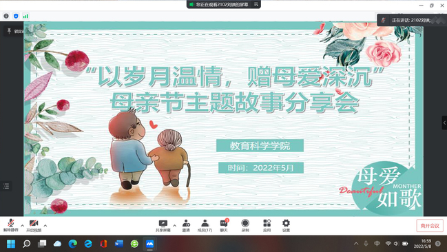 为鼓励同学们学会感恩,珍惜亲情,深入理解母亲伟大而无私的爱,提高家庭和社会责任感,以培育健康心态,塑造健全人格,进一步增强素质教育,弘扬中华民族传统美德,教育科学学院于5月8日下午举办“以岁月温情,赠母爱深沉”主题故事分享会,全体学生积极参与。