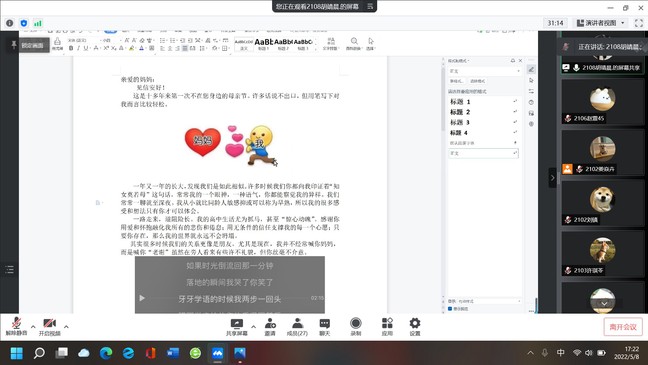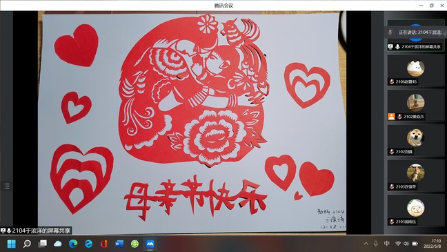 天底下最伟大的是母爱,每个人的一路成长都离不开母亲的关怀和爱护,母亲给予我们的温暖恰似春日里一缕微风,又如秋日中一抹丰硕。参与者们紧紧围绕“母爱”主题,抓住那一缕微风,回忆缝隙里遗留的美好,或用相框定格岁月匆匆带来的奇妙联系,寻找母亲的青春年华;或用笔墨挥洒难言的情绪,献给母亲无言的祝福;或用红色彩纸刻出溶于心头的回忆,表达对母亲深沉的思念。同学们在参与本次活动过程中回首往事,将对母亲的祝福与思念倾注于作品中,充分体现母爱的伟大,也让聆听者感受到母爱的伟大。
