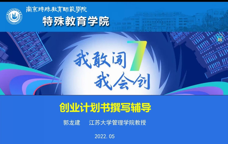 为进一步增强师生的创新创业意识,提升创新创业能力和水平,激发师生参与创新创业训练和比赛的积极性,特殊教育学院于5月9日晚在线上面向全院师生举办“我敢闯,我会创”——创业计划书撰写专题辅导。讲座邀请江苏大学管理学院郭龙建教授传经送宝,特殊教育学院党总支副书记李鹏主持讲座。