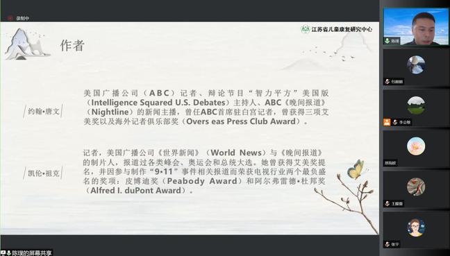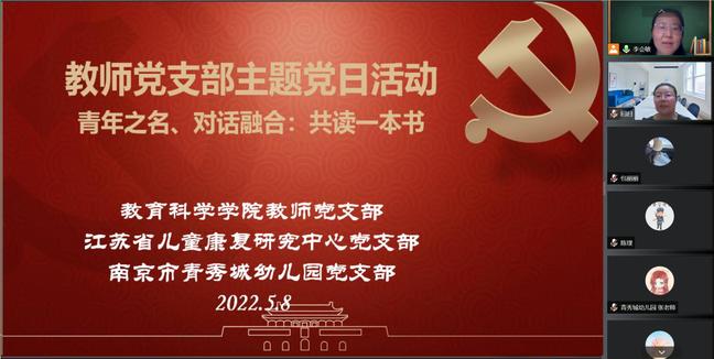 本次活动首次实现了三家单位党支部的“云见面”,这是江苏省儿童康复研究中心党支部、南京市青秀城幼儿园党支部以及教育科学学院教师党支部的首次合作。2022年5月8日,大家齐聚云端,以儿童为中心,以书本为媒介,以博爱为同心圆的读书分享活动,参加活动的不仅有各位党员教师,还有教科院18级、20级卓越班同学。