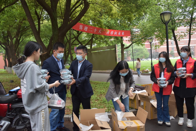 当天中午,学院党政班子全体成员、全体辅导员们在志愿者的协助下,将爱心饭盒运送至相关宿舍楼前发到同学们手中。在发放现场,同学们保持“一米线”的安全距离快速有序地领取餐盒,老师们详细询问大家的生活情况,叮嘱同学们要高度重视疫情防控工作,积极配合学校的防控举措,鼓励同学们自备可重复使用的餐盒到食堂打餐,减少堂食。