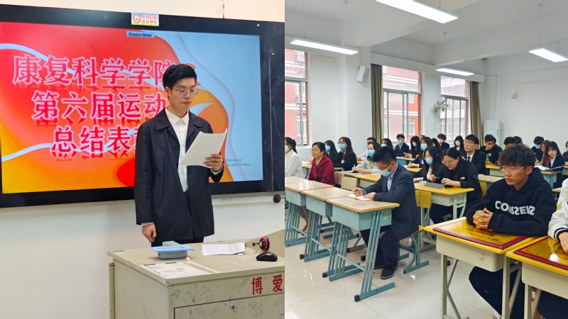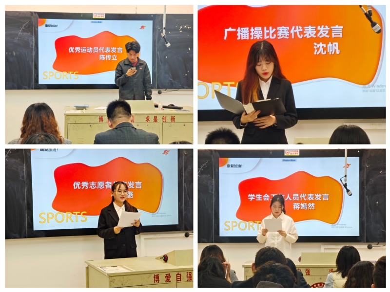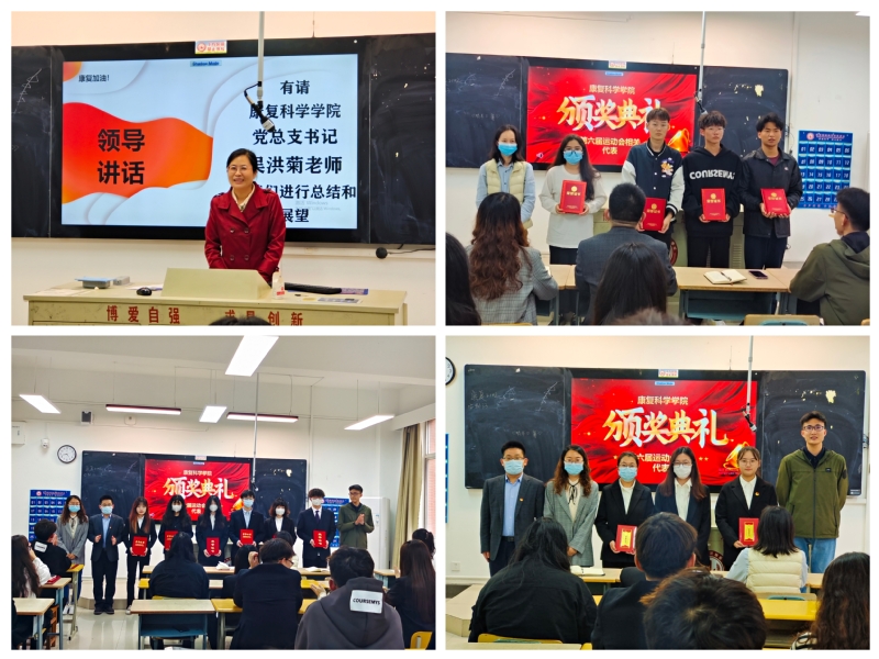 优秀运动员代表陈传立同学、广播体操比赛代表沈帆同学、优秀志愿者代表杨莹璐同学、学生会工作人员代表蒋嫣然同学依次发言,纷纷表达了自己的心得体会。各位代表同学不仅表达了他们内心的真情实感,同样也传达出每一位康复学子的内心感受。在表彰颁奖环节,由学院书记和辅导员老师为在运动会中表现优秀的同学们颁发证书。