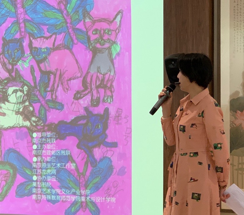 首先南京原生艺术工作室创办人郭海平致辞,他介绍到本次参加展览的创作者均被医学诊断患有自闭症、智力发育障碍、脑瘫、精神分裂症等一种或多种精神障碍的患者或康复者,精神障碍虽然限制了他们像普通人一样的“正常”思维,但同时也给予了另一种维度的天赋,他们需要克服种种困难表达自己的天赋,通过不断练习,用最纯朴的色彩和线条描绘出天马行空的作品,让原生艺术家们心灵的“桃花源”更加接近自然,也更深入人心。
