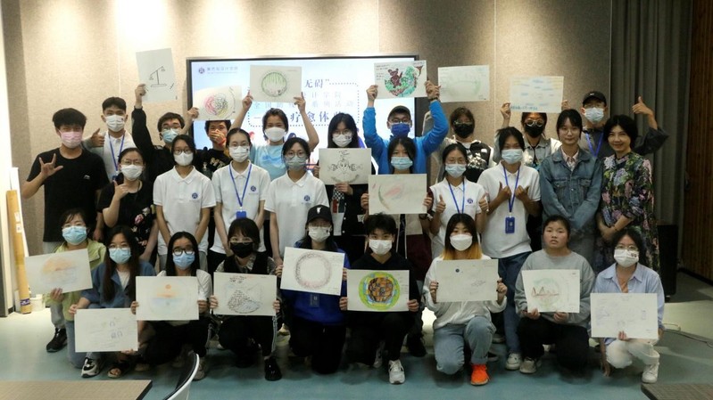 主讲老师介绍完曼陀罗艺术疗愈后,引导大家用各种方式在纸上画出心里的想法,通过绘画唤起自己积压在心底的情绪,并进行释放。“想跟大家去海边看日出”“因为自己没法出门所以画了个小熊替我出去玩”“想出去看电影”“想回家看看爸爸妈妈”“心情很烦躁,很烦恼”“也许降低期望就会减少失望”。同学们用手语解读着自己的心里“画”,当手语翻译同学一字一句地用嘹亮的声音说出他们每一个人的想法时,在场的各位真切地感受到了同学们的情绪。在疫情之下,大家似乎都觉得被束缚住了。但是借助绘画,脑洞大开的画面、各种奇思妙想不断涌现,同学们可以想象着没有疫情的大学生活。