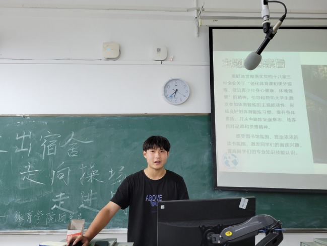 紧接着,体育1901班包涵硕围绕“走出宿舍、走向操场、走进图书馆”行动的概念、意义与具体做法进行阐述,指出强健民族体魄、振奋民族精神、提升民族素质是体育人的使命,自力更生、攻坚克难是体育人的奋斗路径。作为在座的每一位体育人,应自觉树立健康第一的理念,落实“三走”行动,带动更多周边同学在体育锻炼中享受乐趣、增强体质、健全人格、锤炼意志。