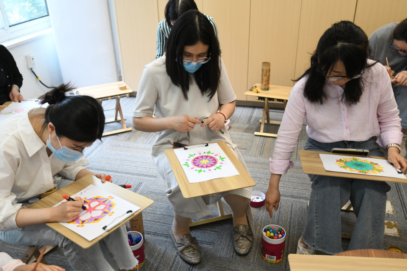 本次教职工活动以彩绘曼陀罗的形式开展,通过在固定模板上进行涂色,以表达内心世界。在身体准备阶段,老师们首先通过正念练习,进行放松训练,将注意力集中在呼吸上,体验真实的身体反应,感受宁静和放松。在静心体验阶段,老师们选择不同的曼陀罗卡片进行绘制。绘制过程中老师们将自己内心的情绪、故事、意向用不同的颜色进行表达,通过专注当下,关注内在的自我,释放情绪。最后在愉快分享阶段,部分老师们展示了自己作品并分享感受。