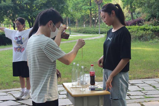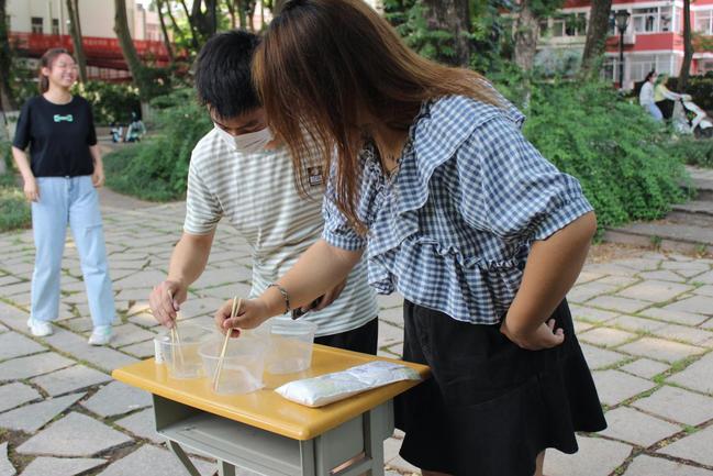 本次活动以游戏闯关的形式展开,由“心有灵犀”“我的鼻子在哪里”“海带啊海带”“排排坐夹果果”“背对背拥抱”“你又是谁”“谁比谁手抖”“扑克炸弹”“贴贴吧”等9个小游戏组成。在“排排坐夹果果”的游戏中,同学们分为两组进行夹弹珠比赛,需要组内一人将五个弹珠用筷子加入另一个空碗中,而另一人再将弹珠夹回之前盛弹珠的碗中,用时最少的一组获胜;在“谁比谁手抖”的游戏中,一组同学每人可以获得两根筷子,将筷子悬停在啤酒瓶上方,使筷子自由落体,使其掉入啤酒瓶中,四根筷子有一根掉入啤酒瓶中则算获胜。在游戏中赢得胜利便可以获得贴纸,并凭贴纸在签到处领取小礼品。活动现场呈现一片欢乐的气氛,同学们踊跃参加游戏,时不时传来阵阵笑声。在活动中,充分展现了大学生对童年的回忆,对童心的追寻,也是给每一位同学的礼物。