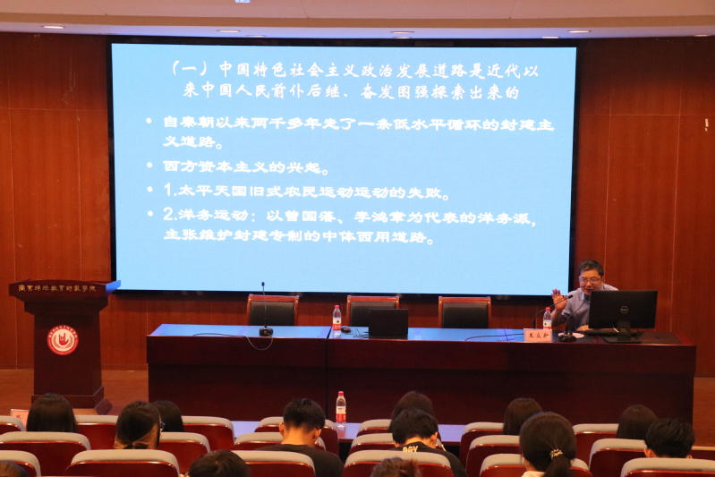 王立新教授的讲座题目是“坚定不移走中国特色社会主义政治发展道路”。王立新教授强调改革开放以来,我们党在长期探索的基础上,成功开辟了中国特色社会主义政治发展道路,并且毫不动摇地坚持和发展这条道路,为我国经济社会发展提供了坚强政治保障。这是我国取得举世瞩目发展成就的一个重要原因。