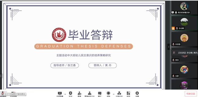 毕业论文是人才培养的重要环节,也是对学生专业知识、综合运用能力的全面检验。为确保学院2020级学前教育本科函授班人才培养的质量,结合我校继续教育学院的相关规定,学院于2022年6月8日晚,开展了成人高等学历教育函授本科毕业论文线上答辩。学院教师张兰香、李会敏、韩媛媛、牟连菊参加了本次答辩工作。