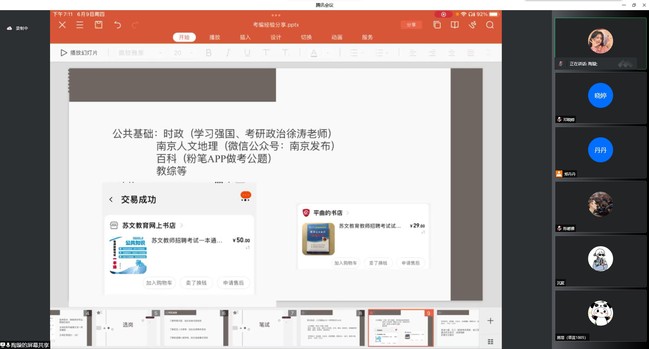 日前,语言学院在线上举行第三场“青春锋芒 榜样领航”优秀毕业生考编经验分享会。会议由今年上半年考取南京秦淮区小学语文教师编制的2018级汉语言文学专业的陶璇同学主讲,学院团总支书记(学工办主任)郑丹丹主持。
