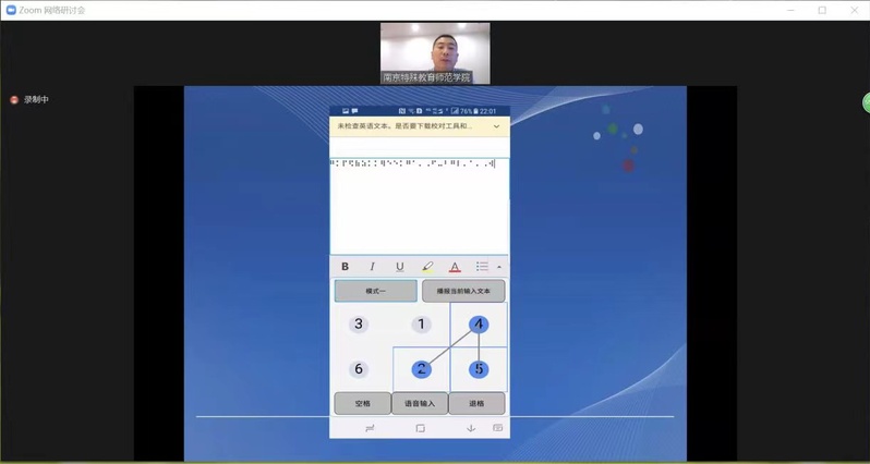 会议筹备前期,我校多名教师积极参与论文投稿,其中金梅教授、张居晓副教授、谢明辰老师的论文予以录用并受邀进行发言。会议中,金梅教授在“AR技术支持下冰雪运动在特教学校体育教学中的应用研究”的主题发言中介绍了所带团队将AR技术应用于特殊教育学校体育课堂的方法,及其对特殊儿童的身体素养、合作创新与表达能力培养的重要意义。张居晓副教授“基于Petri网和RBF网多重手势识别输入盲文”的介绍从智能交互技术方面,探寻解决弥补残疾人自身不足,缩小或消除“信息鸿沟”,实现视障人群的信息无障碍,生活服务的提升。谢明辰老师通过讲述“基于图数据库的手语语义挖掘”,展示了如何以手语词汇为研究对象,探索手语结构标注、语义归纳等相关问题,从而为手语语义词典编纂、手语机器翻译等提供理论基础和实践经验的方式方法。