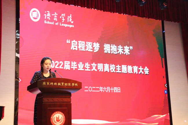 为确保语言学院2022届毕业生离校工作安全、稳定、文明、有序,助力毕业生踏上人生新征程。6月14日下午,语言学院召开“启程逐梦 拥抱未来”2022届毕业生文明离校主题教育大会。学院党政班子全体成员、毕业班班主任、教研室主任、党支部书记、全体辅导员和毕业生参加会议。会议由学院党总支副书记谢军主持。