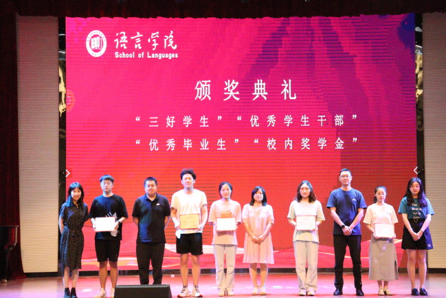 学院执行院长王东在会上做了热情洋溢的致辞,他在讲话中希望全体2022届毕业生用理想凝聚青春力量、用学习夯实成长道路、用安全意识护航人生、用奋斗筑牢人生基石。学院副院长徐琴芳、刘海军分别宣读了《语言学院2022届毕业班校内奖学金获奖学生名单》《语言学院2022届毕业班三好学生、优秀学生干部、优秀毕业生名单》。毕业班班主任上台为受表彰的毕业生代表颁发荣誉证书。