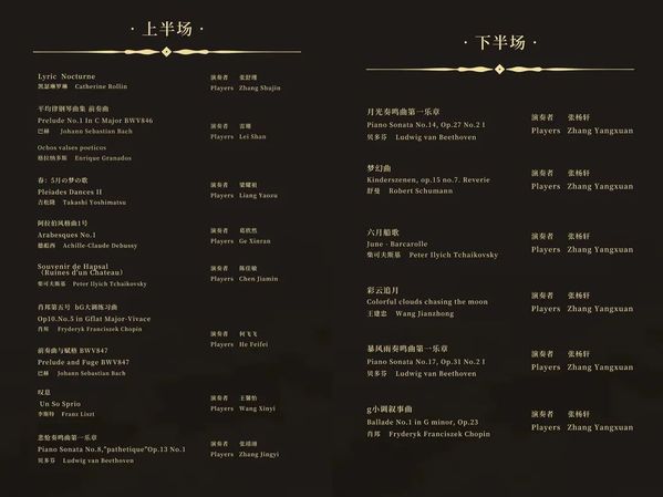 上半场音乐会,张舒瑾、雷珊、梁耀祖、葛欣然、陈佳敏、王馨怡和张靖翊同学依次为我们带来钢琴曲目:《Lyric Nocturne》《平均律钢琴曲集》《Prelude No.1InCMaior BWV846》《五月的梦的歌》《阿拉伯风格曲1号》《哈普萨的回忆》《降G大调练习曲》《前奏与赋格》《叹息》和《悲怆奏鸣曲》。曲声交织,跌宕起伏,我们仿佛穿梭在钢琴悠久的历史中。