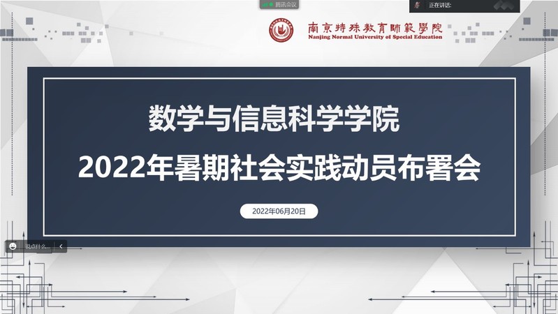 6月18日晚,数学与信息科学学院线上召开2022年暑期社会实践动员大会,学院团总支负责人樊琬老师以及实践队员、各班团支书参加了大会。