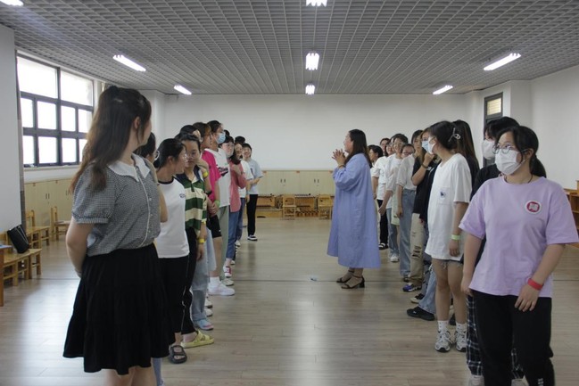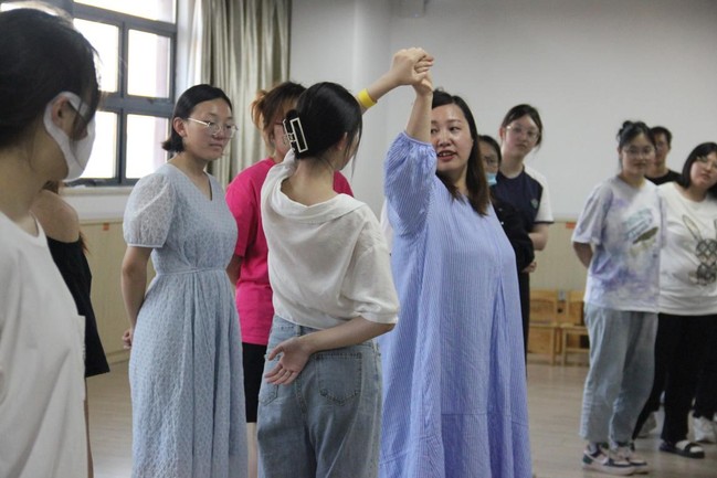 实践环节中,老师指挥同学们分成两列,部分女生同学扮演男生角色,两两牵手跳舞,大家随着老师的演示开始尝试,整个过程充满欢声笑语。大家和着节奏,慢慢向前舞动,在这一刻,抛开烦恼和忧愁,踏步蹲起,合手转圈,大圆小圆,在优美的旋律中,在老师风趣幽默的指导下,每个人都是灵动的音符,在音乐中舞动着自己的身体,难得新奇的体验给参与的每位同学带来了意想不到的收获。整个过程舞伴并不固定,不停变换,寻找有相同颜色手环的小伙伴,最后重新聚拢汇合,就如生活中会遇到各种各样的友人们,与之相识然后分别再开启新的旅程。随着队形不断地调整,同学们更加熟练,完全沉浸其中,感受艺术的愉悦放松。从开始到结束,同学们的微笑从未停止,达到了放松身体、愉悦心情的目的。