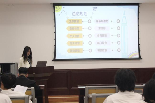会议伊始,党总支副书记吴兴致辞。他指出一会三心各部门要发挥应有的水平,明确工作职责,有高度责任心和服务意识,各司其职、团结协作、相互协调,分工而不分家。会议的第二部分,学生组织代表进行述职报告。“一会三心”各分管主席结合PPT分别从工作方向、工作概述、未来规划等方面进行汇报,并结合个人三年来的工作进行总结。会议的第三部分,指导老师李维翔老师和余宛琳老师讲话。李维翔老师从“时间”“感谢”“传承”三个词展开,表达自己对团组织未来发展的期望;余宛琳老师希望大家能够团结一心,戒骄戒躁,勇担重任。会议的第四部分为竞选环节,候选人分别从个人经历、工作优势和工作设想三方面进行汇报,提问答辩环节,让老师和同学们更加了解候选人。会议最后,吴月华书记用“一个信念”“两种精神”“三个立足”“四个发力”表达了对学生干部工作的要求和期望。希望同学们首先要坚定理想信念,培养奉献精神、实干精神;其次,做到“三个立足”,要立足学习、立足学院,更要立足现在的工作学习,放眼未来;最后,着眼“四个发力”,注重相关工作规范、工作水平、工作成效、工作创新,努力打造出一支素质高、作风硬、业务精、能力强的学生管理工作队伍。