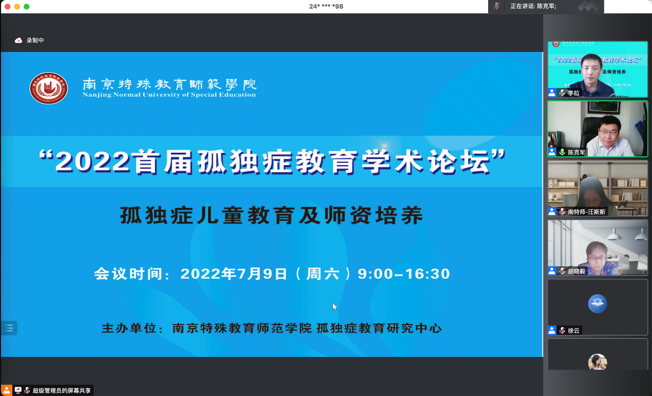 2022年7月9日,我校孤独症教育研究中心举办了“首届孤独症教育学术论坛”,邀请了来自浙江工业大学、华东师范大学、北京师范大学、重庆师范大学、香港地区、美国的知名专家学者以及基层学校的校长与教科研负责人,共10余名国内外顶尖的孤独症教育领域专家,共聚云端,围绕孤独症儿童教育与师资培养的主题展开研讨。线上参会人员突破六百余人,反响热烈。