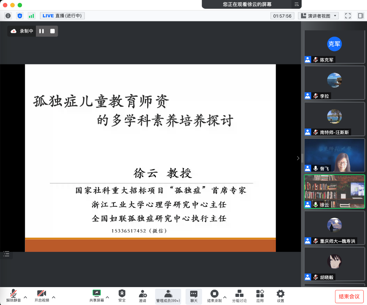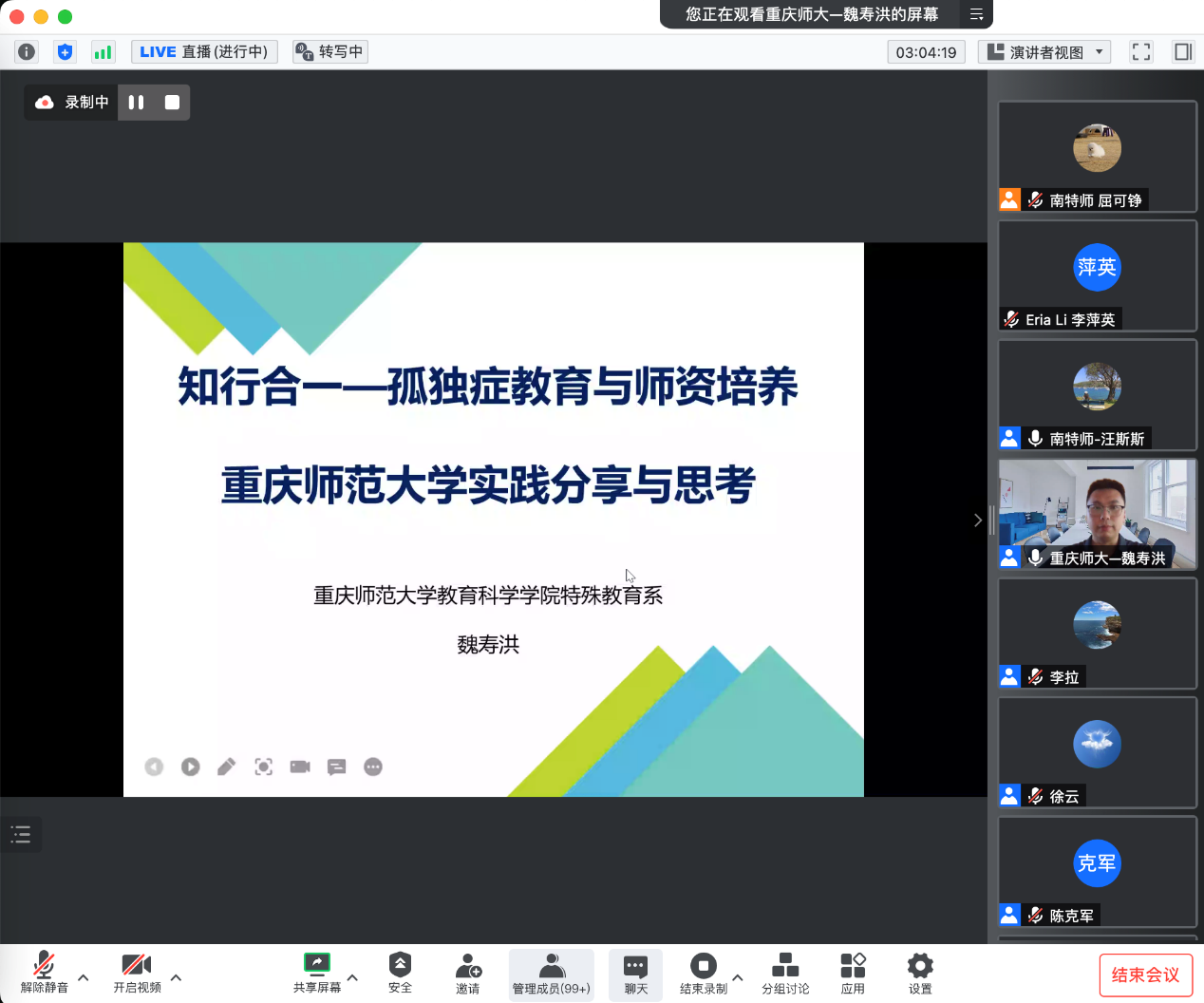 重庆师范大学魏寿洪教授立足的重师大自闭症研究中心,为我们分享了在孤独症儿童教育及师资培养、课程资源建设等方面的实践探索,为我校孤独症教育研究中心开展孤独症儿童的教学实践、培养孤独症教育师资提供思考框架。