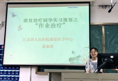 这次活动先后邀请了南京市第一医院康复科杨婷副主任治疗师、南京医科大学儿科学院副院长池霞教授、江苏省人民医院康复医学中心张勤副主任治疗师、南京特殊教育师范学院副教授夏宝妹博士、南京医科大学康复医学院於伟副教授、江苏省人民医院康复医学中心李超主管治疗师、江苏省人民医院康复医学中心儿童康复组组长范亚蓓副主任治疗师,主讲的主题分别为“脑卒中后认知功能障碍”“儿童常见心理行为问题”“临床常用心肺康复方法”“毕业论文设计与撰写”“以能力胜任为导向的康复治疗学专业就业与择业”“浅谈骨科康复”“康复治疗学同学实习规划之‘作业治疗’”。