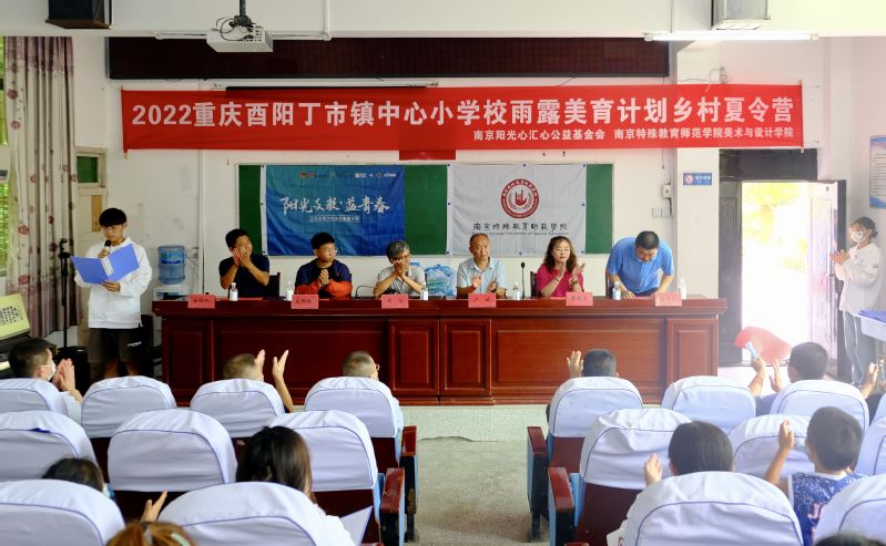7月25日,美术与设计学院雨露美育乡村夏令营开营仪式在重庆市酉阳县丁市镇中心小学隆重举办。校党委常委、副校长谭忠,贵州省遵义市特殊教育学校校长余贞文,重庆市酉阳县丁市镇副镇长卢斌,南京阳光心汇心公益基金会助教部部长宋佩瑶,美术与设计学院党总支副书记薛皓洁,重庆市酉阳县丁市镇中心小学校长甘红阳和南京特殊教育师范学院、重庆市酉阳县丁市镇中心小学部分老师、“雨露美育乡村夏令营”全体志愿者、重庆市酉阳县丁市镇中心小学部分小学生及家长一起参加了本次开营仪式。