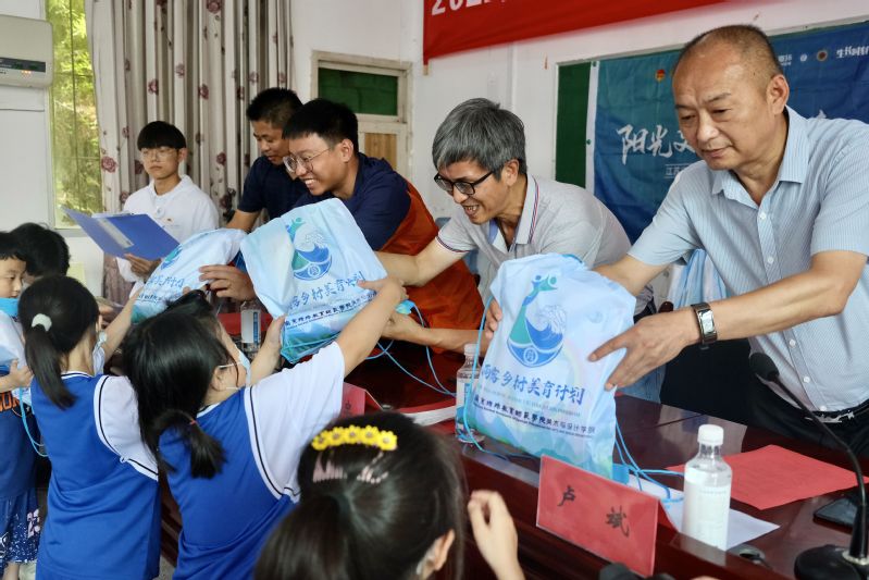 为了给孩子们带来更好的学习体验感,南京特殊教育师范学院美术与设计学院雨露志愿团队的成员们为了此次夏令营做了精心准备,除了长达半年的团队建设、磨课练习,志愿者们还利用专业技能,通过个人美术作品售卖等形式自行筹资,为孩子们准备了雨露美育学具包,学具包中包含了勾线笔、水彩笔、绘画本、毛毡等美术学习用品。在签约授牌之后,各位领导和老师为参加此次夏令营的孩子们一一发放雨露美育学具包。