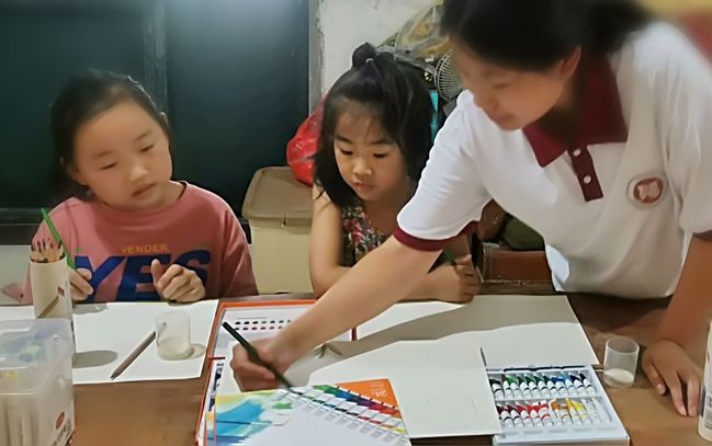 “1921年7月23日,上海的盛夏,天气酷热。13个青年代表从全国四面八方赶到上海一个幽静小院,召开中国共产党第一次代会......”活动开始,团队负责人陈田雨同学用生动的语言向孩子们讲述了《一条小船诞生一个大党》的党史故事,带领孩子们了解中国共产党历经波折的诞生过程,孩子们听得格外投入。接着,团队成员与小朋友们互动交流,引导孩子们能画笔勾勒红⾊印记,⽤⾊彩点燃爱国情怀。孩子们拿起⼿中的画笔,绘出⼀幅幅⾊彩斑斓、充满童趣的作品,有的画出了⾼⾼飘扬的党旗,有的书写了祖国壮丽的河⼭,有的体现了对⽣命关怀的温情,包含着孩⼦们对党和国家的颂扬、对⽣活的热爱以及对未来的憧憬。在绘画过程中,团队成员给予指导,帮助孩子们共同完成化作。在大家的共同努力下,孩子们⽤鲜艳的⾊彩完成数幅主题鲜明的绘画作品,表达了对党和国家的热爱,描绘出对美好⽣活的期盼。