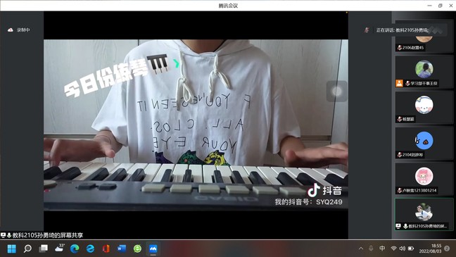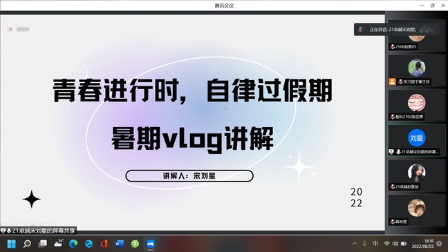 本次比赛分为两个部分。第一个部分为前期制作发表,大家将剪辑的视频发到抖音app获得点赞量;第二部分通过线上会议的方式,选手对自己的作品进行细致讲解。会议开始,主持人对本次活动流程做了详细介绍,大家的分享拉开了序幕。选手们的vlog真实展现了大家充实且有趣的暑假生活。视频中,大家运用了一些专业的运镜手法和剪辑效果,提升了视频整体视觉感受,并搭配轻巧欢快的背景音乐,给人视觉和听觉的双重享受。在视频作品中可以看到,有的同学通过暑假实践增加了阅历、增长了才干,有的同学在幼儿园实习工作中收获了经验,有的同学则是抓紧暑假时间认真学习努力增加知识储备。总的来说,大家的假期生活过的美好且充实。