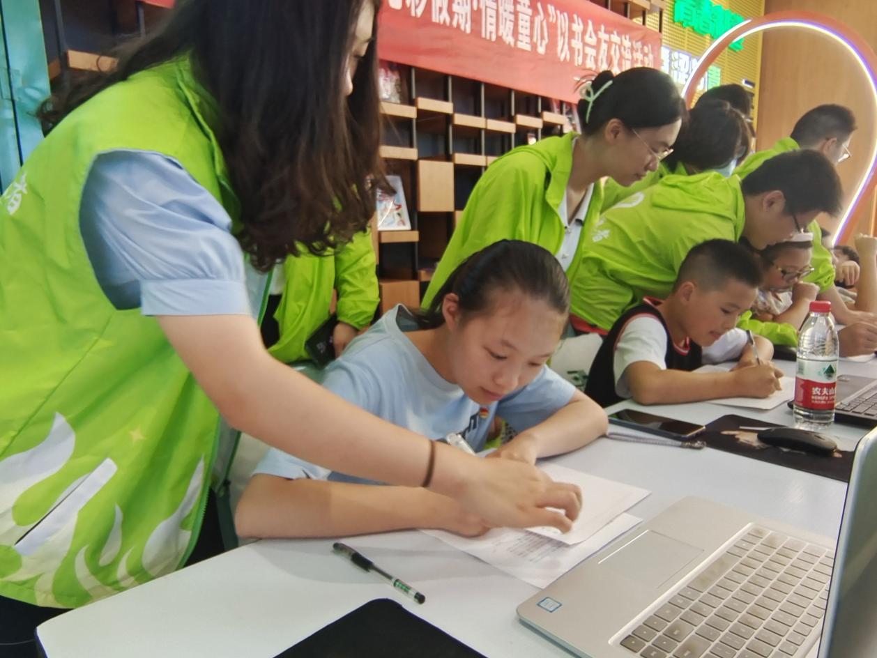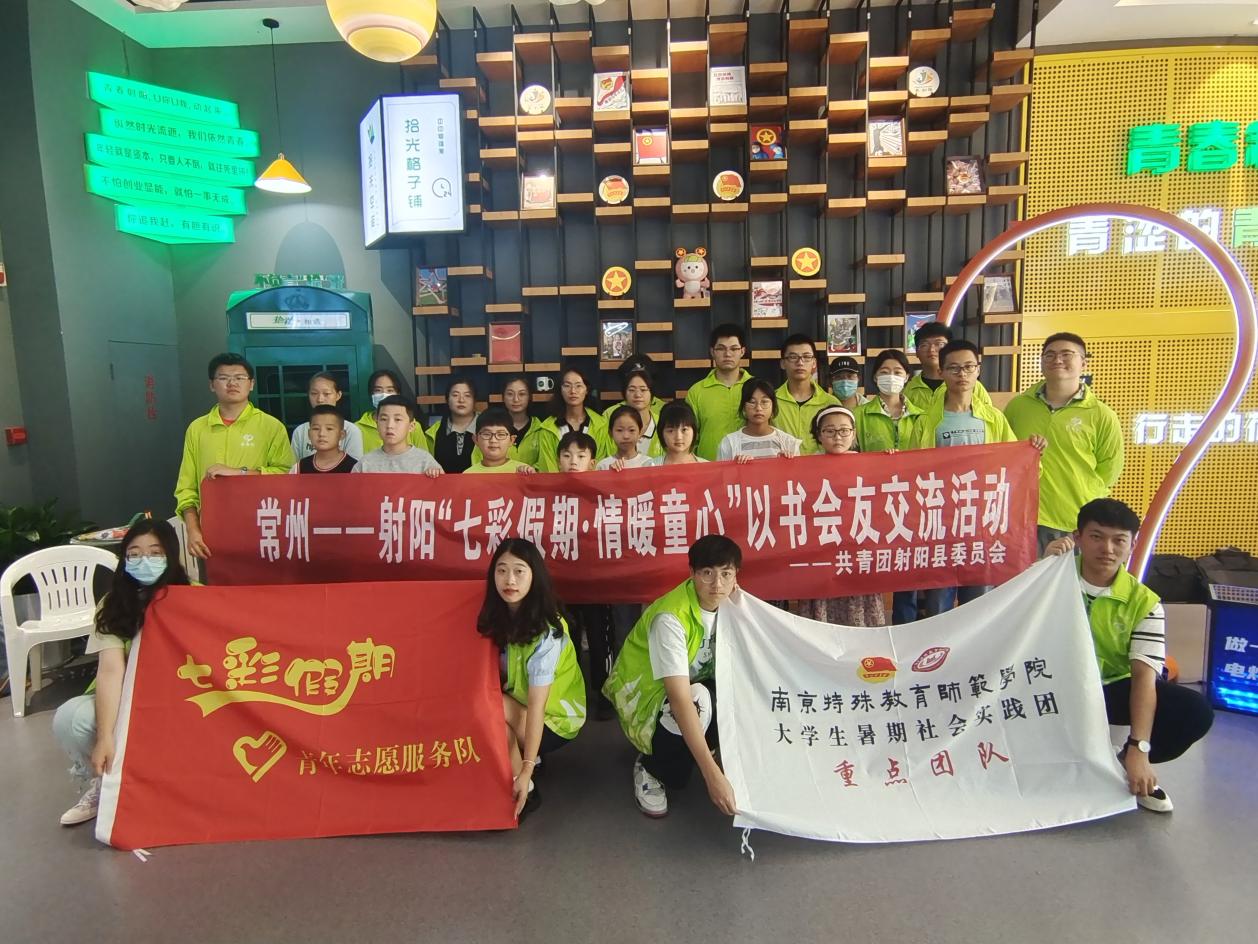 为深入学习习近平总书记在庆祝中国共产主义青年团成立100周年大会上的重要讲话精神,纵深推进“梦想改造+”关爱计划,加强对青少年儿童的关爱、服务工作,增强少年儿童对文学的热爱,帮助孩子们“扣好人生的第一粒扣子”。7月29日下午,中国青年志愿者协会“七彩假期”志愿服务示范团队、南京特殊教育师范学院语言学院暑期“三下乡”社会实践活动校级重点团队“萤火计划”志愿服务团队联合共青团射阳县委员会,于江苏省盐城市射阳县“青·拾光”青年之家总店举办射阳—常州“七彩假期·情暖童心”以书会友交流活动。活动由驻外团工委社会联络部副部长朱烨主持,驻外团工委副书记暨项目负责人李欣、社会联络部副部长祁超策划,南京特殊教育师范学院校团委、语言学院进行支持和指导,语言学院执行院长王东教授给予指导。