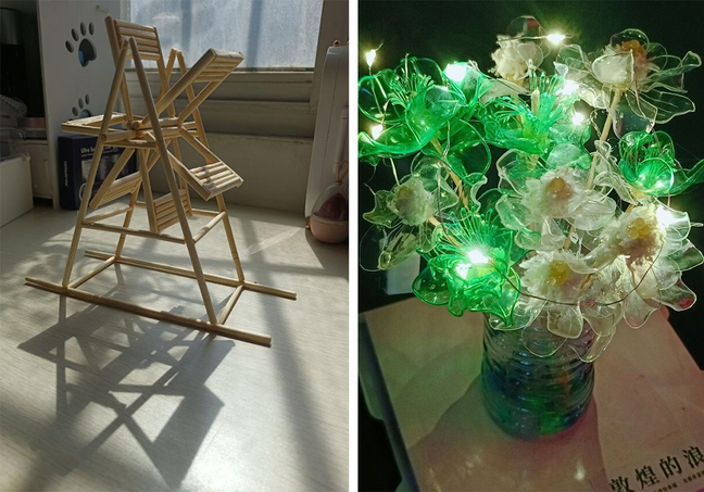 活动前期,大家都踊跃报名,发挥学前教育专业技能,精心制作了手工作品。各位参赛选手用实物图片展现了作品的创意设计,并配以详细的文字说明,即作品原料来源、功能用途以及传达理念。有的是利用牛皮纸包装袋做成了既实用又美观的抽纸盒,有的采用快递纸盒裁剪成收纳盒,有的用铁丝和塑料袋制作成美丽的“永生”花,有的则是用一次性筷子做成了有趣的风车,这件作品取名为《筷意循环》,意思是将环保理念传承下去……独特的创意,精湛的工艺,新奇的名字使一件件优秀的作品脱颖而出,成为独一无二的环保典范。