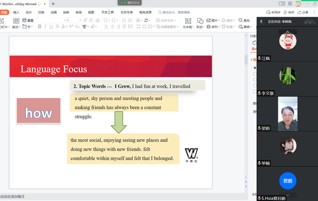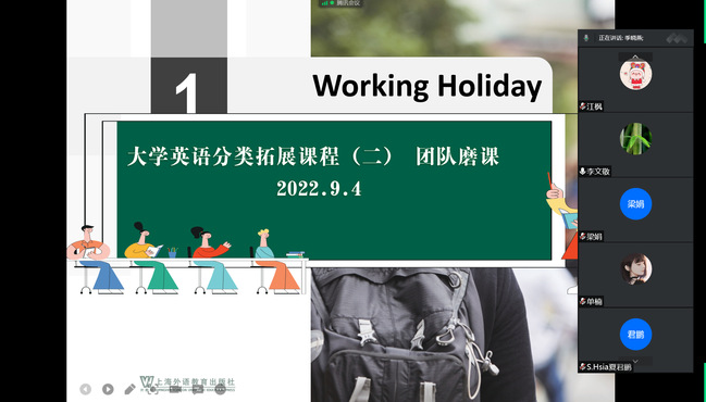 9月4日,为上好开学第一课,以全新的面貌迎接新学期,大学外语公共教研室举办大学英语分类拓展课程(二)教学团队线上磨课活动。磨课活动由教研室主任季晓燕主持,全体大学英语分类拓展课程(二)教学团队老师参加。
