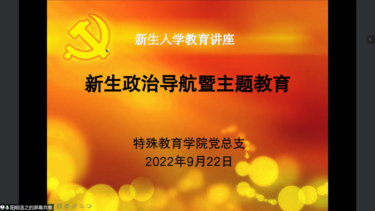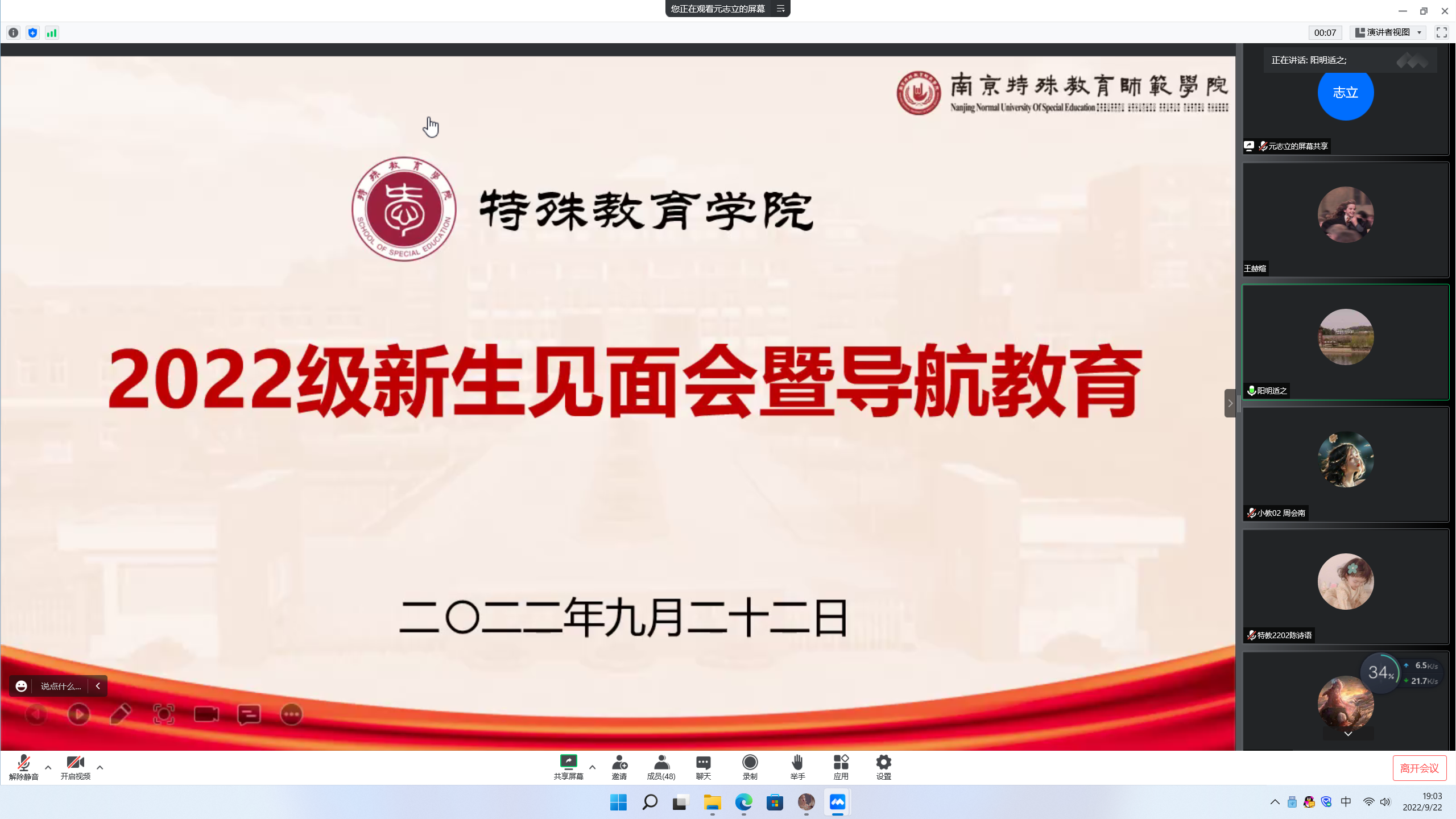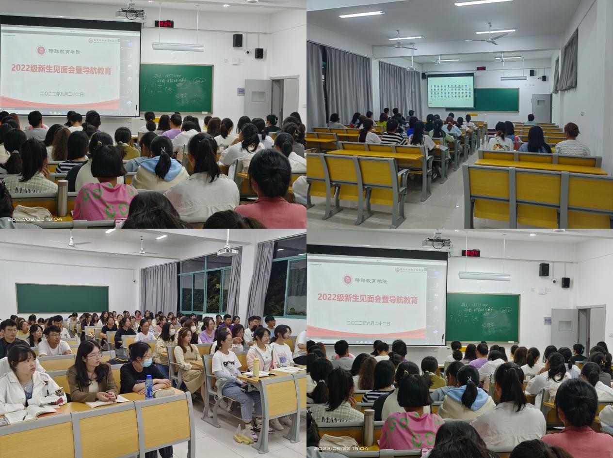为增进2022级新生对所学专业的了解,明确学习目标,树立远大职业理想,特殊教育学院于9月22日晚举办“2022级新生见面会暨导航教育”主题活动。学院党总支书记叶亮、院长李拉、副书记李鹏、副院长张伟锋、特殊教育系主任陈琳、小学教育系主任赵文超、手语翻译系主任韩梅及带班辅导员和班主任线上参加会议,2022级各班新生在江宁校区教室参加会议,会议由学工办副主任元志立主持。