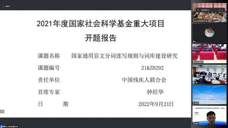 9月21日,我校参与的2021年度国家社会科学基金重大项目《国家通用盲文分词连写规则与词库建设研究》(项目编号21&ZD292)开题会,于北京、上海、南京、青岛等地,线下线上同时举行。中国残联副主席、副理事长程凯,教育部语言文字信息管理司二级巡视员王丹卉,中国残联理事、中国盲协主席李庆忠,中国盲文出版社、中国残联计划财务部、中国残联教育就业部、国家手语和盲文研究中心、中国盲文手语推广服务中心、北京联合大学特殊教育学院等单位相关负责人出席,开题会由北京语言大学李宇明教授主持。